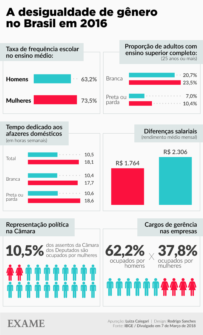 No mercado de trabalho, a média salarial dos homens é de 2.306 reais, enquanto a das mulheres é de 1.764 reais. Eles ocupam 62,2% dos cargos gerenciais nas empresas, e elas apenas 37,8%.