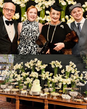 Claudio e Cristina Aboim com os anfitriões Renata e Willian Tannure e depois detalhe da mesa de doces