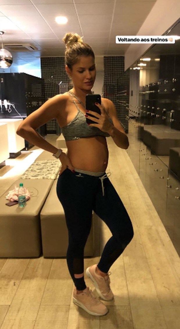 Na imagem, ela posa no vestiário da academia e tira uma foto mostrando a barriga da gestação. “Voltando aos treinos”, escreveu a modelo no clique. O casal já tem Gabriel, que completou 8 meses recentemente.