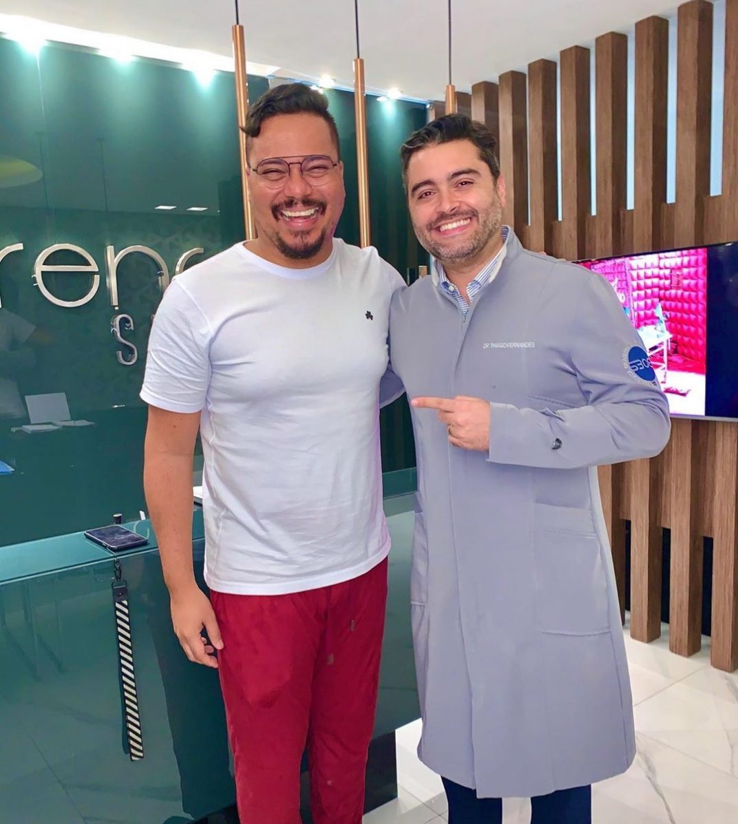 Bruno Cardoso, vocalista do grupo Sorriso Maroto, prestigia o dentista Tiago Fernandes, da clínica Reference Smile.