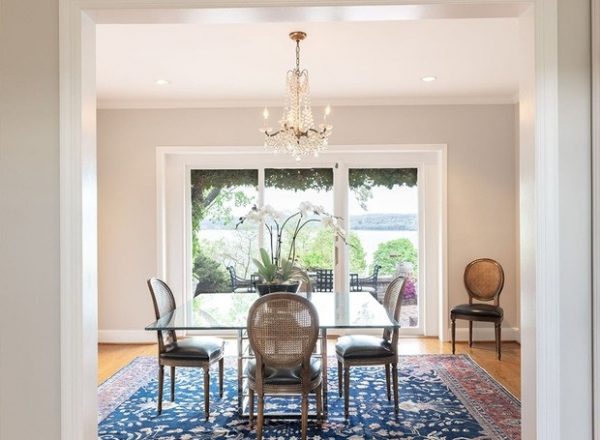 Com decoração clássica, o imóvel tem 371 metros quadrados. O espaço tem 4 quartos e 4 banheiros. O hall de entrada leva direto a uma escada para o segundo andar e também está ligado à sala de estar que possui lareira e janelas grandes com vista panorâmica para o rio. Portas francesas conectam os ambientes e um jardim de inverno com cara de estufa de flores leva à área de lazer.