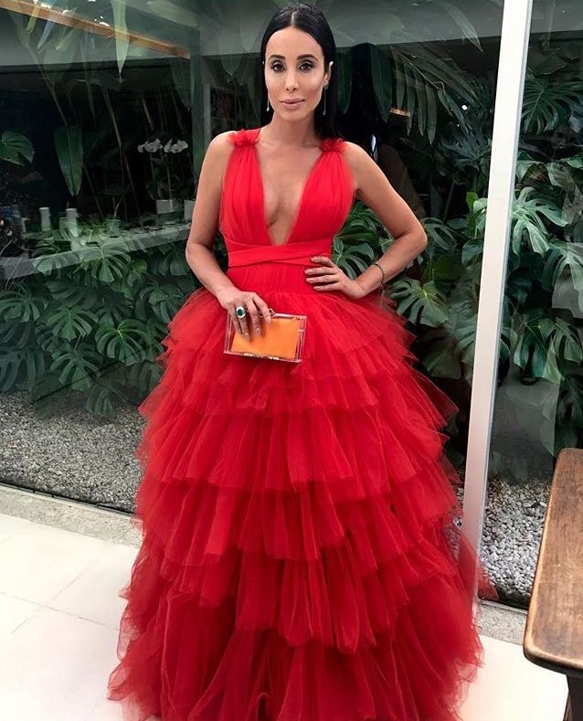 A atriz Carol Marra também optou por um vestido da nova coleção de Vitor Zerbinato. A peça vermelha em tule rodado é um dos ícones da nova coleção Inverno 2018 da marca.
