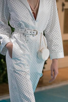 Diversão do verão como o prazer de brincar com os acessórios: colares coral, maxi óculos, bolsas Zenzi em sarja. Couro metálico e borracha são combinados para criar estampas onduladas multicoloridas, sapatos vazados. Chinelos de piscina atoalhados. As novas sandálias de Capri.