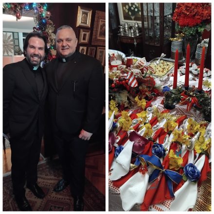 Padre Gleuson Gomes e Monsenhor Andre Sampaio observam a bela mesa do jantar