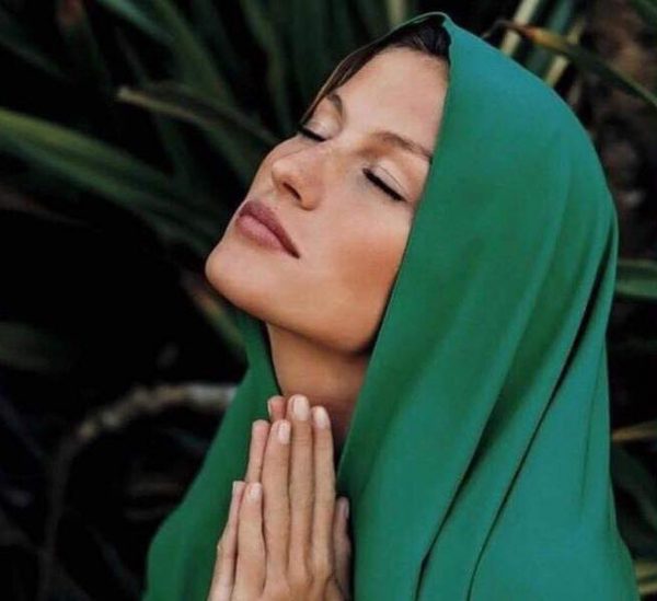 Gisele fez um slide com imagens e depois da cidade afetada e uma fotografia sua, com um manto verde na cabeça e as duas mãos juntas em forma de prece.