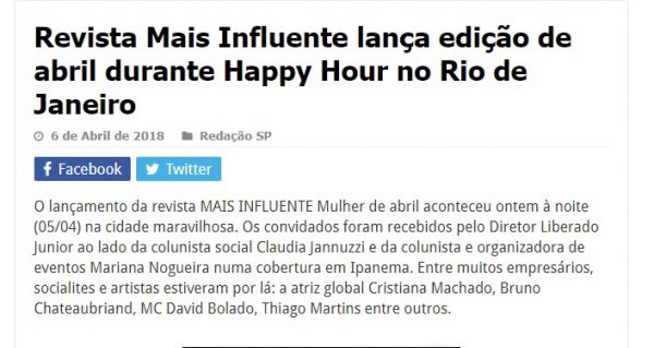 Lançamento da Revista Mais Influente no portal Folha Nobreabril 2018 Clique na imagem e confira a publicação sobre a festa de lançamento da nova edição da revista Mais Influente Mulher. Siga-nos no Instagram
