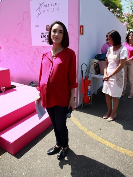 Em rara aparição pública, Maria Prata, mulher de Pedro Bial, exibiu o barrigão de nove meses de gravidez neste domingo (8), no Parque Ibirapuera, na abertura do evento “Giro Pela Vida”, realizado pelo Instituto Avon para promover o Outubro Rosa- campanha de prevenção de câncer de mama.