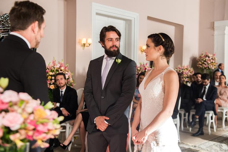 Para completar o visual, Clara surge com tiara de ouro feita pela designer Junia Machado, brincos de diamante pequeno e buquê de orquídeas. Já a maquiagem, criada pela caracterizadora Dayse Teixeira, seguiu a linha natural com batom nude e blush rosa.