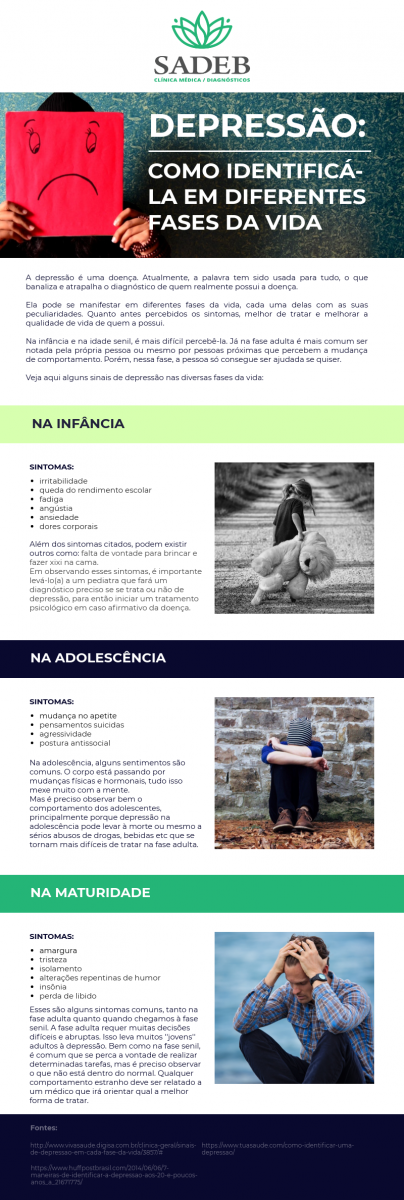A depressão é uma doença grave que afeta hoje grande parte da população. A palavra tem sido usada para tudo, o que banaliza e atrapalha o diagnóstico de quem realmente possui a doença. Ela pode se manifestar em diferentes fases da vida, cada uma delas com as suas peculiaridades. Quando antes perceber os sintomas, melhor de tratar e melhorar a qualidade de vida de quem a possui. Confira neste infográfico, preparado pela Clínica Sadeb, os sintomas e dicas de como identificar a depressão nas diferentes fases da vida.