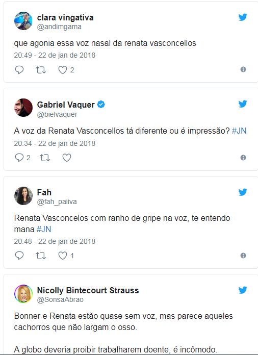 Nesta segunda-feira (22/01), a jornalista Renata Vasconcellos apresentou o ‘Jornal Nacional’ com a voz prejudicada. Bastou isso para ela quebrar a internet e os fãs perceberem que ela estava com algum incômodo, provavelmente provocado por uma gripe. Assista aqui.