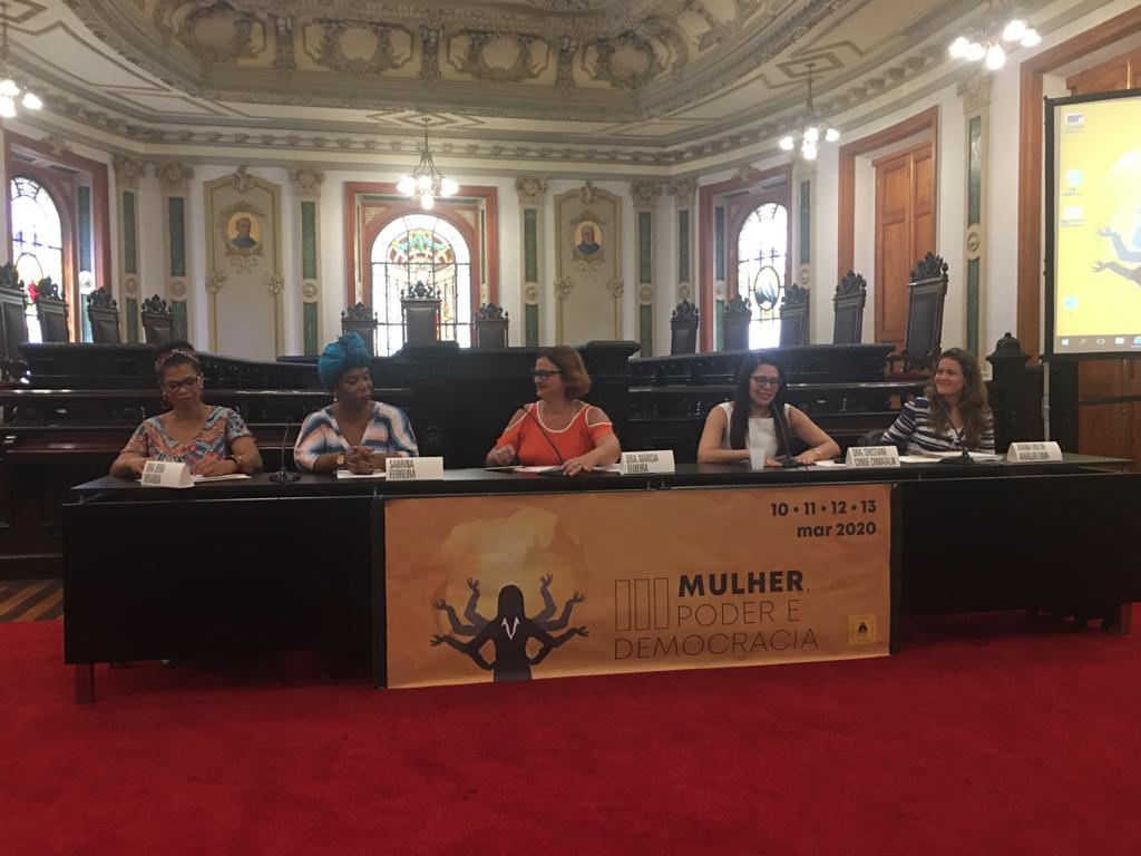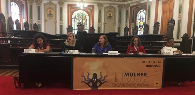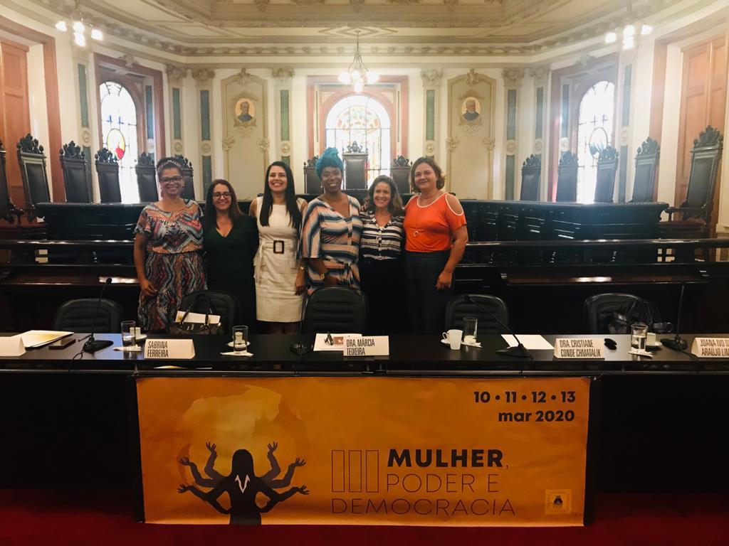Mesa Mulher e política. Da esquerda para a direita: Dra Ivone Caetano – desembargadora do Tribunal de Justiça do Rio de Janeiro; Simone Schireiber – Desembargadora Federal do Tribunal Regional da segunda Região; Ana Teresa Basílio – Vice presidente da OAB, Angela Roberti – Historiador e pesquisadora da UERJ; Naiara Coelho – Mestre em Ciências jurídicas pela Universidade Federal Fluminense