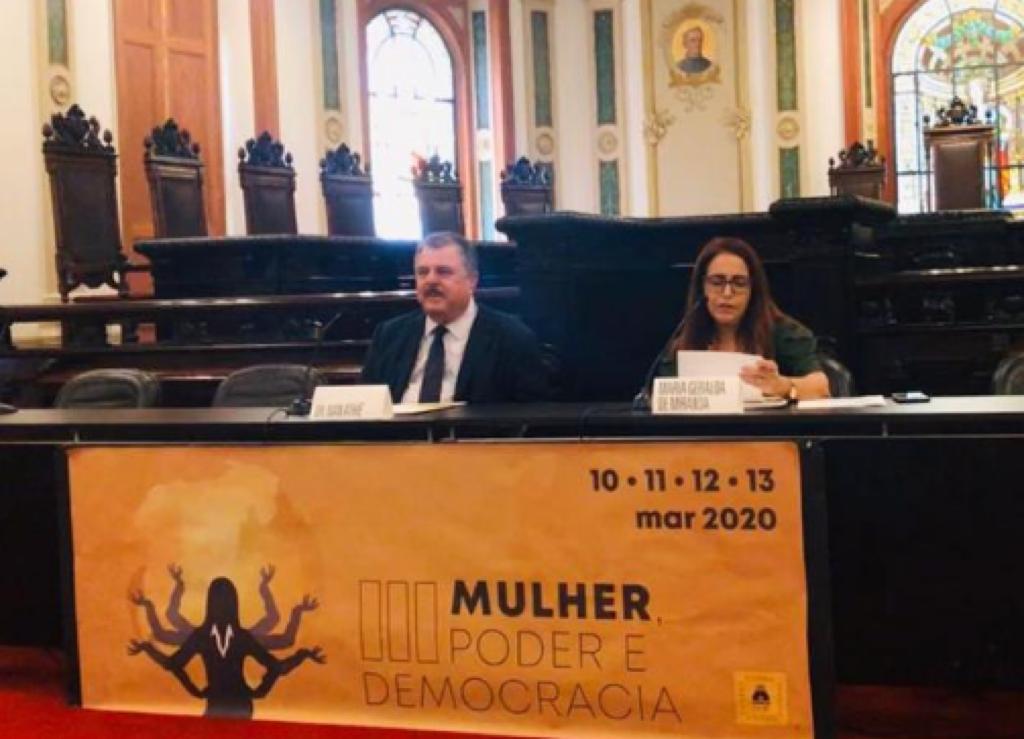 O Desembargador Ivan Athié e a curadora do evento, Maria Geralda de Miranda, na abertura do evento III Seminário mulher, poder e democracia